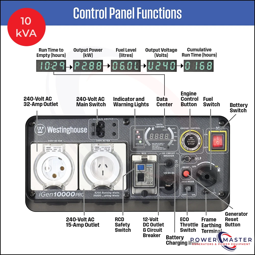 The new iGen10000PRO is the largest Westinghouse inverter generator with an inbuilt RCD electrical safety switch approved for workplace use. It is ideal for standalone plug and socket connection to large or multiple items of portable electric equipment. The benefits of compact size, light weight, low fuel consumption, quiet running and mains quality power are now available for 8 kVA class applications instead of using a traditional fixed-speed generator.
